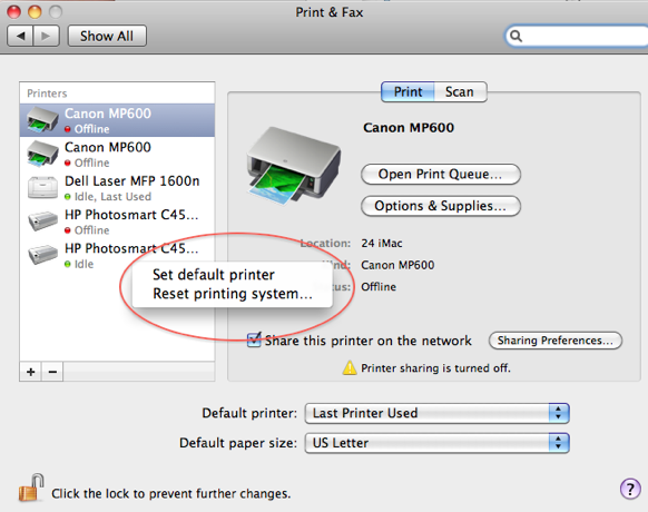 You may also try reseting the print system by right clicking (or control clicking) in the printer window. You’ll see the following: